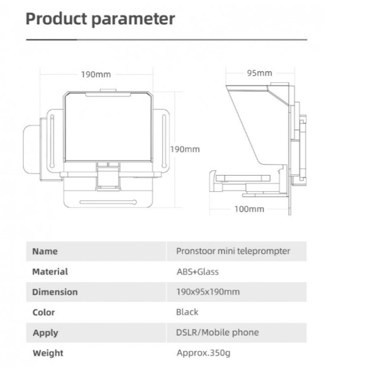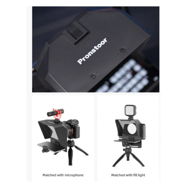 Телесуфлер Pronstoor Mini Teleprompter призначений для смартфонів, дзеркальних і бездзеркальних камер. Як джерело тексту використовується смартфон, який фіксується в стандартний утримувач під дзеркалом суфлера. На нього встановлюється додаток, в якому рухом тексту можна керувати з пульта (також поставляється в комплекті).