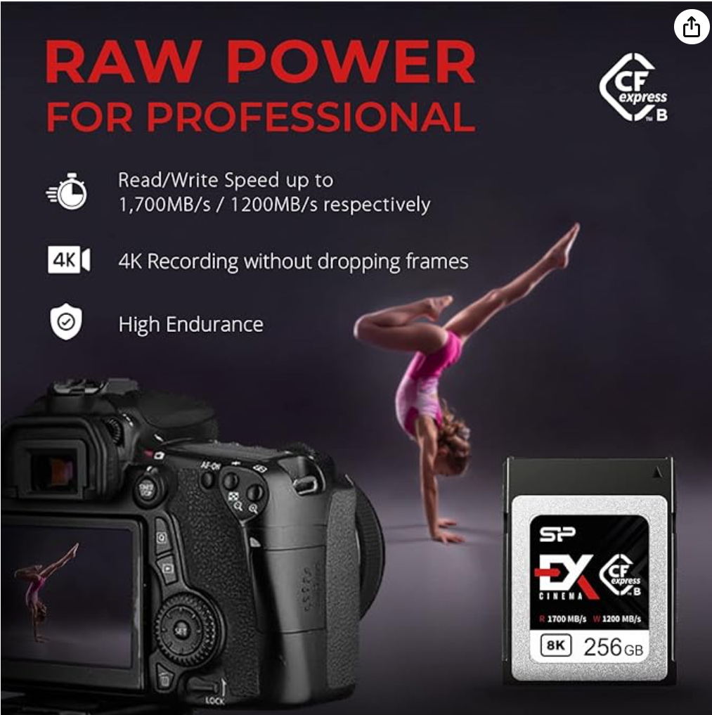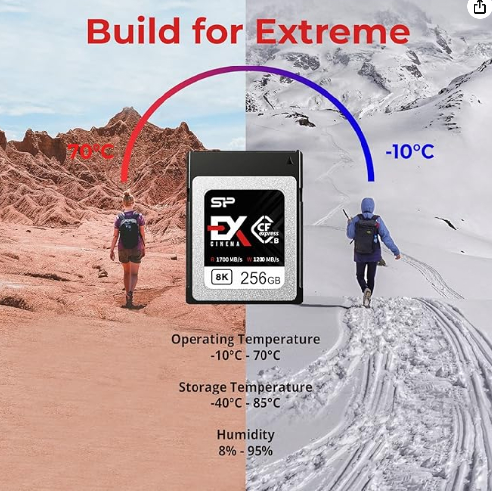 Карта пам’яті Silicon Power Cinema EX CFexpress 2.0 Type B, розроблена для забезпечення високої продуктивності для фотографів і відеооператорів, використовує переваги інтерфейсу PCIe 3.0 x2 / NVMe 1.3, щоб забезпечити швидкість читання до 1700 МБ/с, що дозволяє записувати кіно. -якісне відео 8K із високою частотою кадрів і бітрейтом, а також необроблені та безперервні фотографії. Продуктивність цієї карти підтримується динамічним SLC-кешем, який допомагає підтримувати її постійну продуктивність читання/запису. Загальні характеристики Використовуйте весь потенціал із CFexpress Cinema EX використовує технологію CFexpress 2.0 для забезпечення високої продуктивності для найвимогливіших професійних фотографів і відеооператорів. Його швидкість читання та запису більш ніж у 3 рази вище, ніж у CFast 2.0, що забезпечує максимальну продуктивність цифрових плівкових камер високого класу. Неперевершена швидкість запису Завдяки інтерфейсу PCIe 3.0 x2, а також підтримці NVMe 1.3, Cinema EX може похвалитися екстремальною швидкістю запису до 1200 МБ/с для бездоганного захоплення відео кінематографічної якості, включаючи 8K з високою частотою кадрів і бітрейтом. . Він також підтримує неперервну серійну зйомку без затримки, тож ви не пропустите жодного кадру в критичні долі секунди. Технологія, яка підвищує продуктивність Cinema EX — це більше, ніж просто вражаюча швидкість. Щоб не відставати від темпу, якого вимагають професіонали, мікропрограмне забезпечення динамічного кешу SLC забезпечує оптимальну стійку продуктивність читання/запису, а технологія SmartRefresh підтримує високу продуктивність читання з часом. Технологія для витривалості та стабільності Здатність карти зберігати дані в безпеці так само важлива, як і здатність її записувати. Технологія LDPC ECC і функція Block/Page RAID із 3D NAND гарантують 3K циклів PE для підвищеної довговічності. Прошивка SmartFlush для екранування живлення захищає дані в нестабільних умовах.