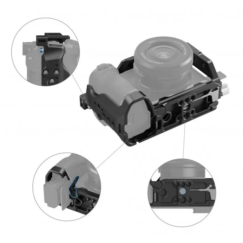 Клітка для фотоапарата SmallRig Cage для Sony A6700 (4336) забезпечує доступ до всіх елементів управління фотокамерою Sony A6700 і пропонує різні варіанти кріплення. На додаток до одного “ холодного башмаку ” і безлічі різьбових отворів 1/4 ” -20 і 3/8 ” -16, ця клітина з алюмінію має кілька кріплень в стилі ARRI для запобігання скручування аксесуарів при установці. Клітка для фотоапарата SmallRig 4336 також має конструкцію, що запобігає деформацію (з гвинтом M2.5, прикріпленим до отвору для ременя) на додаток до кріпильному гвинта 1/4 ” -20, тому фотокамера не бовтається. Ви можете ще додати верхню ручку SmallRig 1984 або дерев’яну бічну ручку 2093 для зручності зйомки з рук, і затиск SmallRig Cable Clamp 3000 для захисту кабелю і порту HDMI фотоапарата. Кріплення типу ARRI зверху і збоку призначені для монтажу фіксує ручки SmallRig ARRI 2165 або Magic Arm 2115 з кульової голівкою. Ця клітина для фотоапарата додатково оснащена планкою НАТО зліва. Монтажні отвори на передній грані дозволяють встановити окремо адаптер об’єктива 2219 або 1764. Є отвори для ремінця, щоб додати ремінці на зап’ясті pAC2456, pSW2398 або шийний ремінець pSC2428. Крім того, в дно клітини для камери SmallRig для Sony A6700 вбудована викрутка для закручування гвинтів.